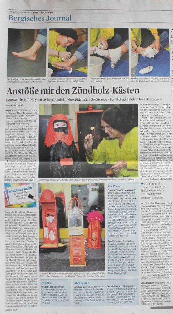Wie bei den Gipsabdrücken von Füßen und auch anderen Körperteilen geht es in den „Zündholz“-Arbeiten um Menschen und Erfahrungen. „Diese ganzen Zündhölzer sind eigentlich mein Leben“, sagt Terheyden. Daher gibt sie der „Zündholz“-Serie einen hohen Stellenwert in ihrem Schaffen. Sie habe vier Kinder und vier Enkel, das präge ihre heutige Perspektive.